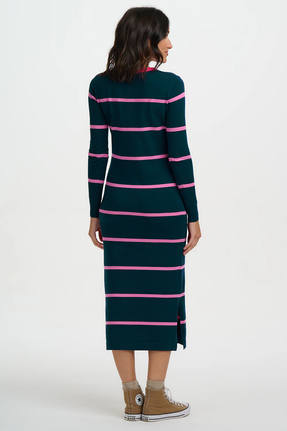 The Liselle Knit Midi Dress is a chic, semi-fitted style designed to flatter with its figure-skimming silhouette. Crafted from the same cosy, textured yarn as our Stacey Jumper, it features a classic crew neckline, long sleeves, and a split side hem for ease of movement. The standout detail lies in its bold pink stripes against the sleek dark teal base.